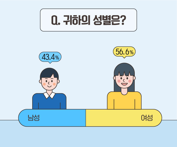 다음으로, 설문 응답자의 성비는 ‘남성’이 43.4%, ‘여성’이 56.6%였습니다.