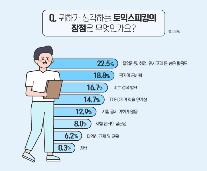 그렇다면 설문 응답자 분들이 생각하는 토익스피킹의 장점은 무엇일까요? 가장 많은 응답자(22.5%)가 ‘졸업인증, 취업, 인사고과 등 높은 활용도’라고 답했습니다. 이어 ‘평가의 공신력(18.8%)’, ‘빠른 성적 발표(16.7%)’, ‘TOEIC과의 학습 연계성(14.7%)’, ‘시험 응시 기회가 많음(12.9%)’, ‘시험 센터의 접근성(8.0%)’, ‘다양한 교재 및 교육(6.2%)’, ‘기타(0.3%)’가 뒤를 이었습니다.