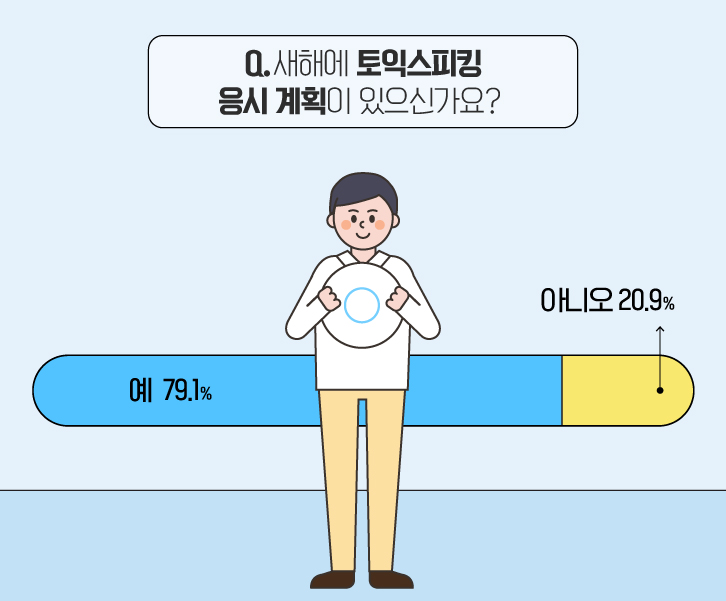 새해 목표로 가장 높은 응답률을 보인 ‘외국어 공부’ 중, 토익스피킹에 응시할 계획을 가진 분들은 얼마나 될까요? 설문 결과, 응답자 10명 중 약 8명은 토익스피킹에 응시할 계획이 있다고 답했습니다. 이를 통해 대다수의 분들이 토익스피킹에 응시할 계획이 있음을 확인해볼 수 있었는데요. 최근 채용시장에서 영어회화를 소화할 수 있는지에 대한 확인이 중요시 되면서, 토익스피킹에 대한 기업의 수요가 높아진 영향이 반영됐다고 보이네요.