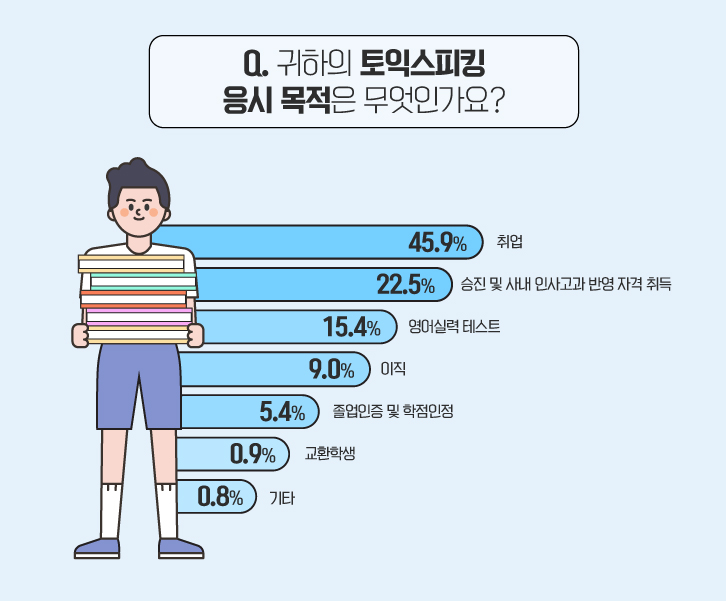 다음으로 토익스피킹 응시 목적을 물었는데요. ‘취업’이 45.9%로 가장 높은 응답률을 보였습니다. 뒤를 이어 ‘승진 및 사내 인사고과 반영 자격 취득(22.5%)’, ‘영어실력 테스트(15.4%)’, ‘이직(9%)’, ‘졸업인증 및 학점인정(5.4%)’, ‘교환학생(0.9%)’, ‘기타(0.8%)’ 순으로 확인되었습니다.