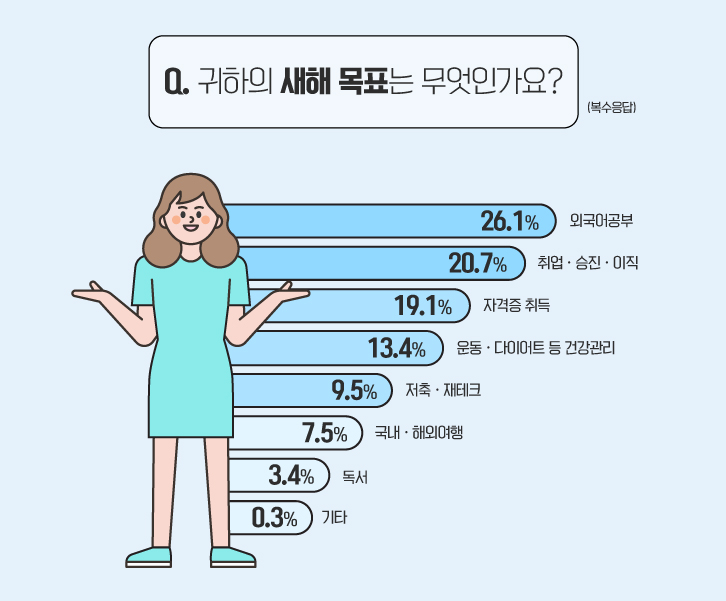 본격적인 첫 질문으로 새해 목표에 대해 물었는데요. 토익스피킹 수험자들 답게 ‘외국어 공부’가 ‘외국어 공부’가 26.1%로 가장 높은 비율을 보였습니다. 이어 ‘취업 · 승진 · 이직(20.7%),’ ‘자격증 취득(19.1%)’, ‘운동 · 다이어트 등 건강관리(13.4%)’, ‘저축 · 재테크(9.5%)’, ‘국내 · 해외여행(7.5%)’, ‘독서(3.4%)’, ‘기타(0.3%)’ 순으로 확인되었습니다.