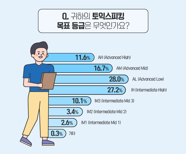 그렇다면 설문 응답자의 토익스피킹 목표 등급은 무엇일까요? 토익스피킹 등급체계는 0~200점까지의 점수를 나누어 ACTFL로 표기합니다. 크게 ‘Advanced, Intermediate, Novice’ 3단계로 나누어지며 ‘High, Mid, Low’로 세분화 되는데요. 설문 결과 ‘AL(Advanced Low)’등급이 28%로 가장 높은 비율을 보였습니다. 뒤를 이어 ‘IH(Intermediate High)’ 등급이 27.2%로 근소한 차이를 보였고, ‘AM(Advanced Mid)’ 16.7%, ‘AH(Advanced High)’ 11.6%, ‘IM3(Intermediate Mid 3)’ 10.1%, ‘IM2(Intermediate Mid 2)’ 3.4%, ‘IM1(Intermediate Mid 1)’ 2.6%, ‘기타’ 0.3% 순으로 나타났습니다.