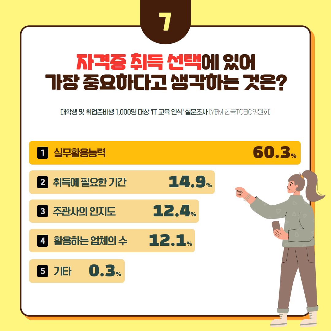 마지막으로, IT 자격증 취득 선택에 있어서 가장 중요하다고 생각하는 요인에 관해 물었습니다. 대학생, 취준생들이 IT 자격증을 취득할 때 가장 고려하는 요소는 '실무활용능력(60.3%)' 이었습니다.