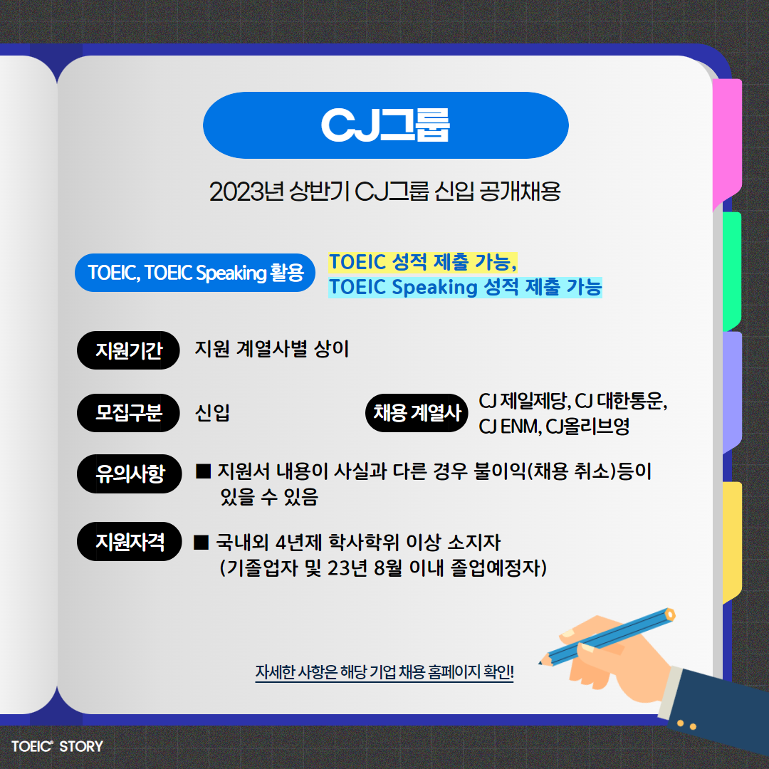 | CJ그룹 | 신입 | 2023년 상반기 CJ그룹 공개채용 | 지원 계열사별 상이 | TOEIC 성적 제출 가능, TOEIC Speaking 성적 제출 가능 |