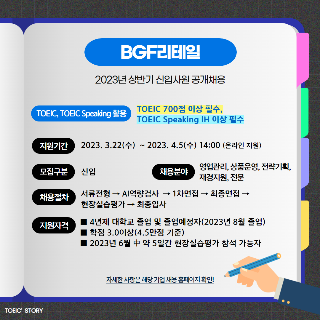 | BGF리테일 | 신입 | 2023년 상반기 신입사원 공개채용 | 4.5(수) 14:00 | TOEIC 700점 이상 필수, TOEIC Speaking IH 이상 필수 |