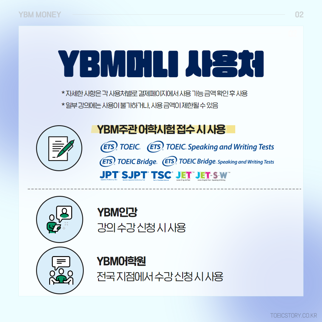 YBM머니는 토익, 토익스피킹, 토익라이팅, JPT, SJPT, TSC 등 YBM 주관 어학시험 접수 시 사용할 수 있습니다.