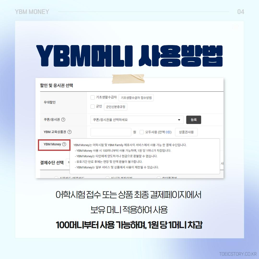 시험 접수 결제창에서 '할인 및 응시권 선택'을 통해 YBM머니를 사용할 수 있습니다. 단, YBM머니는 100머니부터 사용 가능하며 1원 당 1머니가 차감됩니다. 더불어 타인에게 양도할 수 없다는 점 잊지 마세요!
