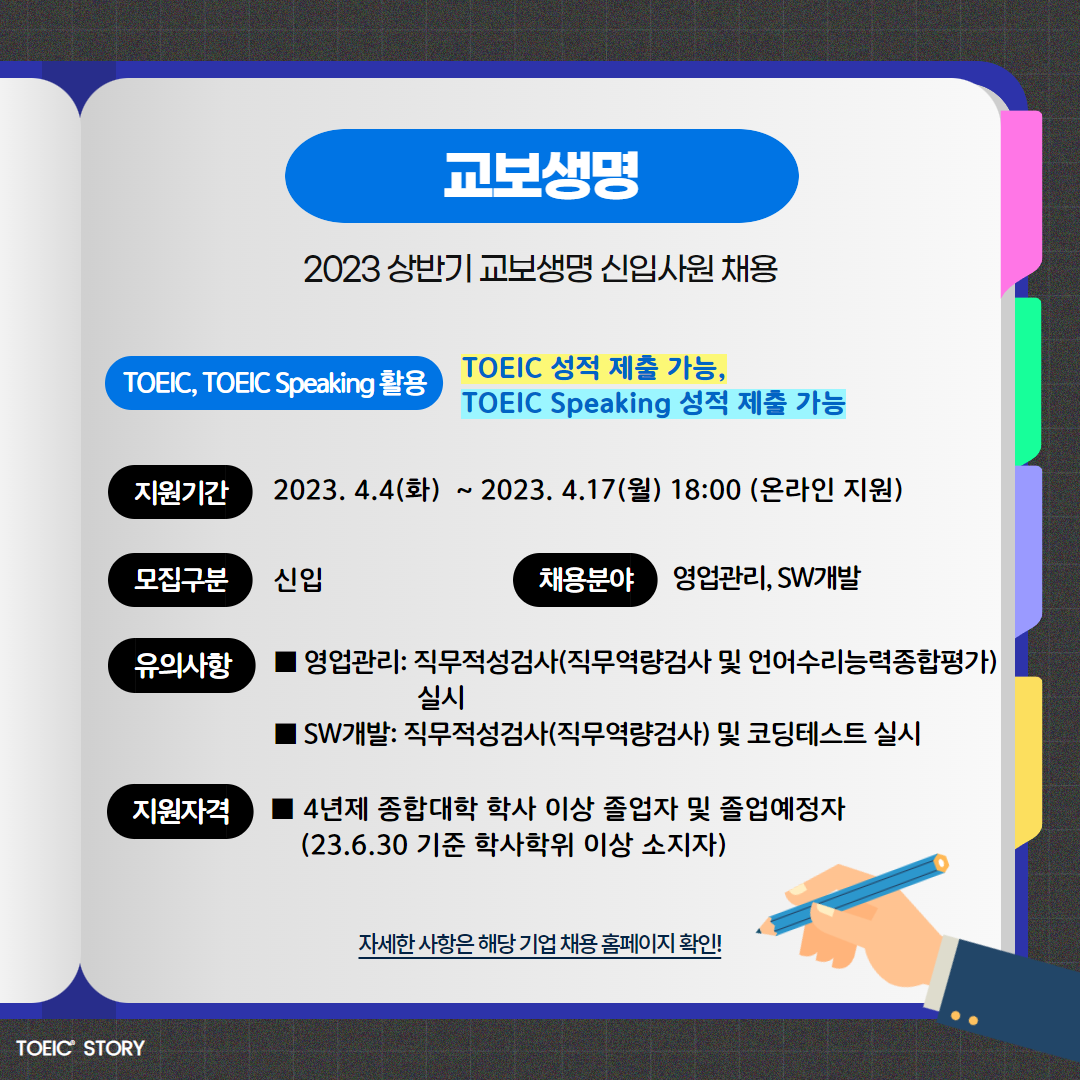 | 교보생명 | 신입 | 2023 상반기 교보생명 신입사원 채용 | 4.17(월) 18:00 | TOEIC 성적 제출 가능, TOEIC Speaking 성적 제출 가능 |