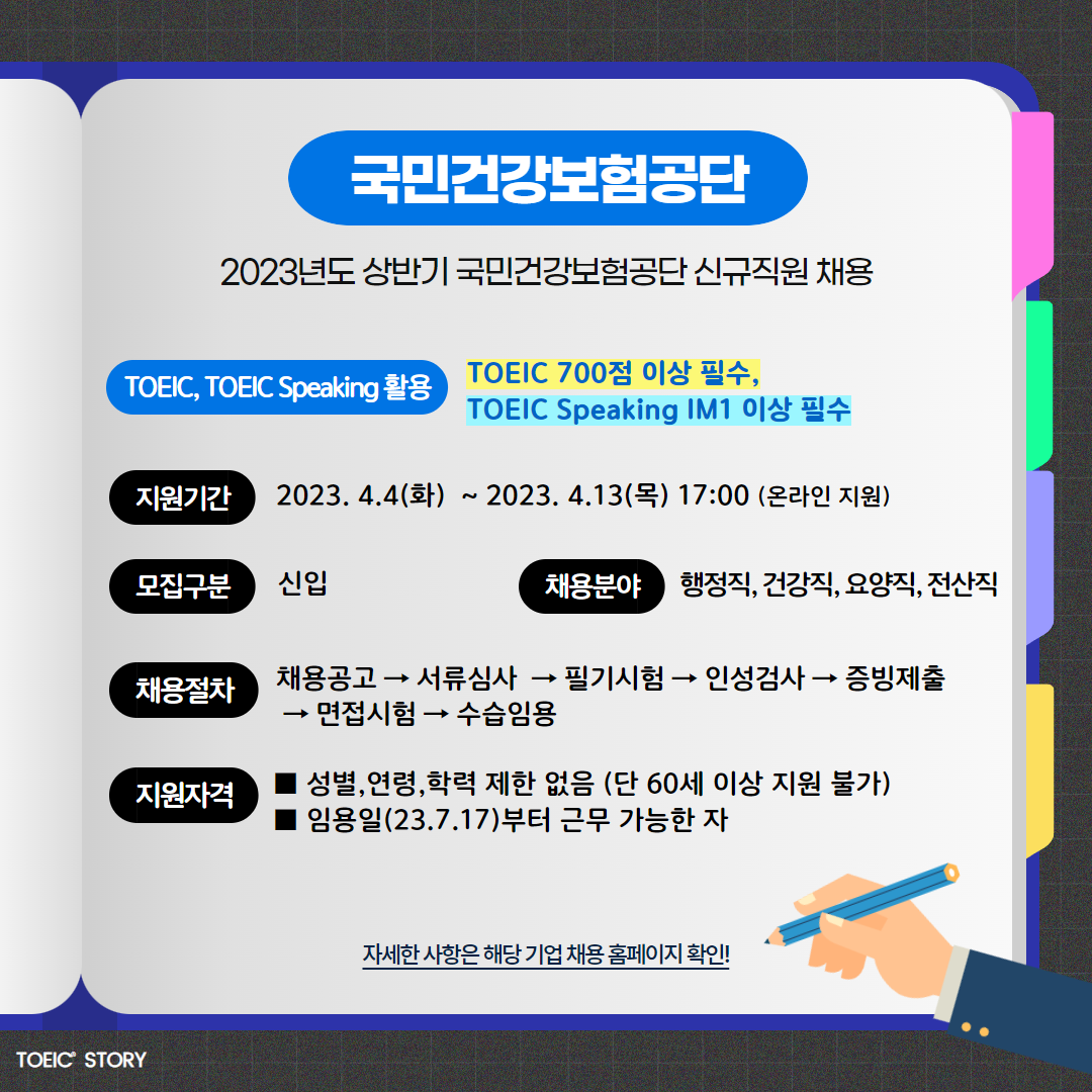 국민건강보험공단에서 2023년도 상반기 신규직원을 채용합니다. 채용직렬은 행정직, 건강직, 요양직, 건강직이며 직렬에 따라 응시 자격이 상이합니다. 행정직의 경우 토익 700점 이상 또는 토익스피킹 IM1 이상의 성적이 필수입니다! 국외시험, 특별시험 및 모의시험 성적은 인정하지 않습니다. :)