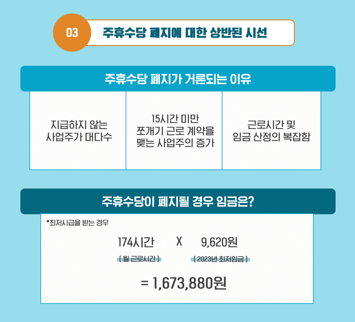 Q3. 주휴수당 폐지가 거론되고 있는 이유와 폐지될 경우 임금은 어떻게 되나요?