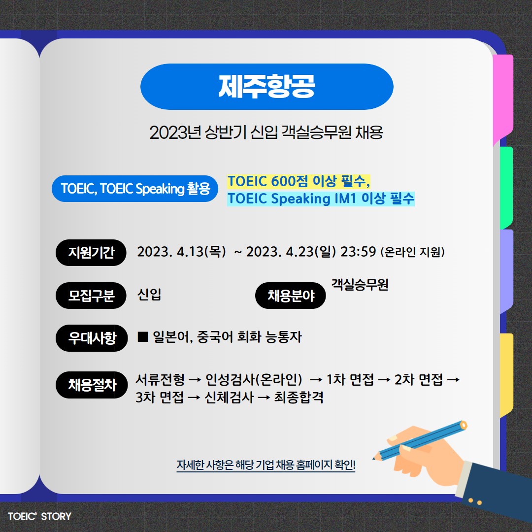 | 제주항공 | 신입 | 2023년 신입 객실승무원 채용 | 4.23(일) 23:59 | TOEIC 600점 이상 필수, TOEIC Speaking IM1 이상 필수 |