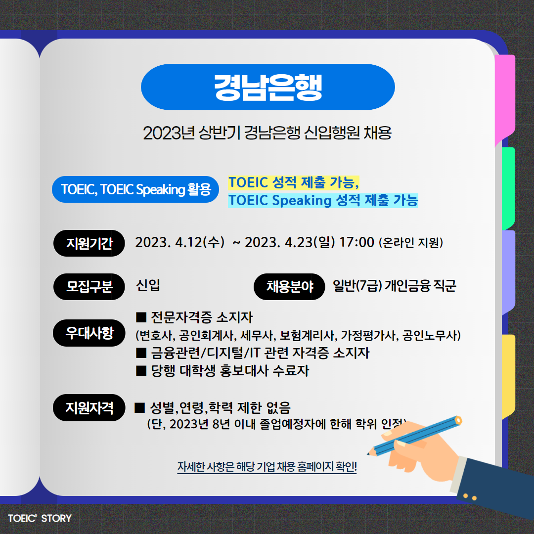 | 경남은행 | 신입 | 2023년 상반기 신입행원 채용 | 4.23(일) 17:00 | TOEIC 성적 제출 가능, TOEIC Speaking 성적 제출 가능 |