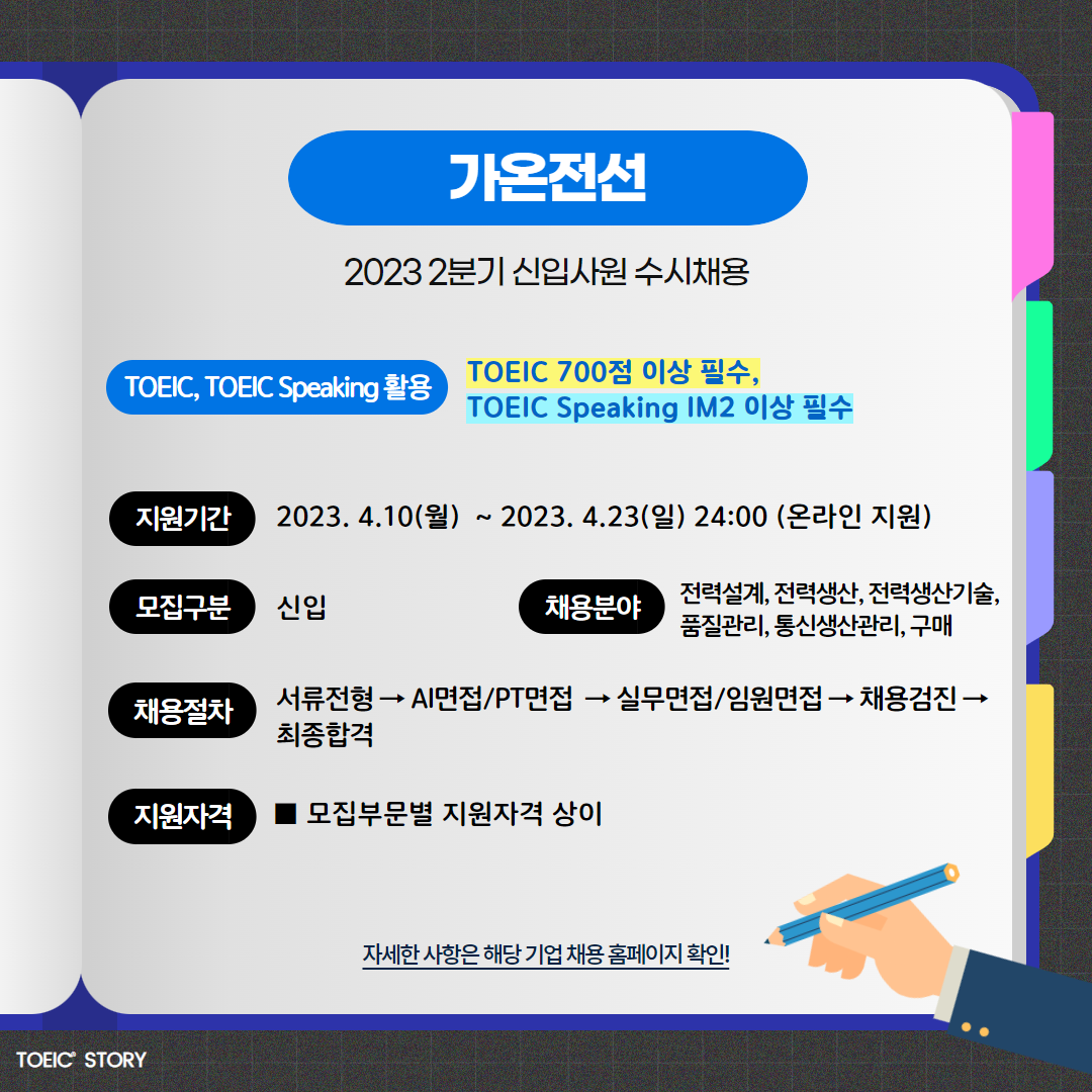 | 가온전선 | 신입 | 2023 2분기 신입사원 수시채용 | 4.23(일) 24:00 | TOEIC 700점 이상 필수, TOEIC Speaking IM2 이상 필수 |