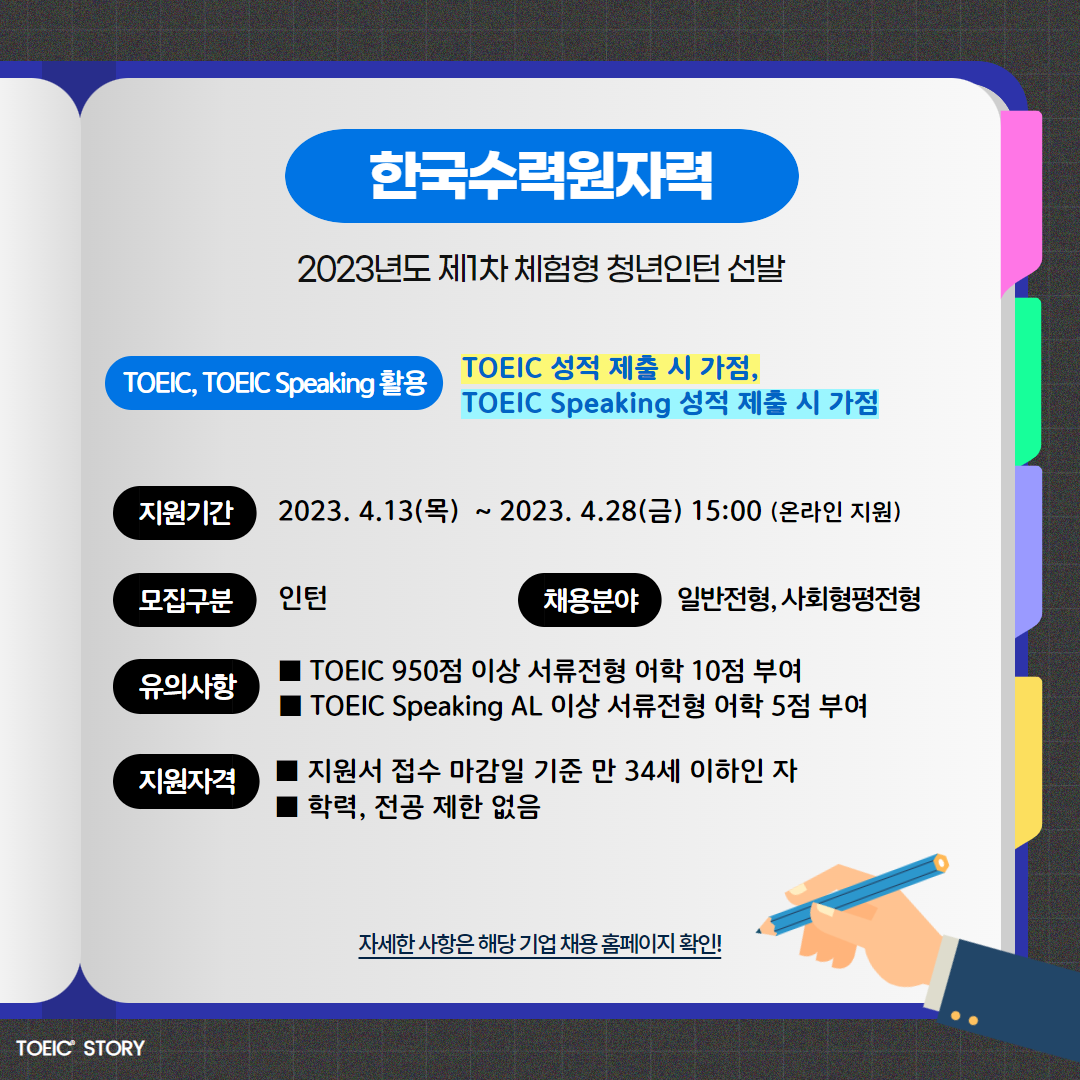 | 한국수력원자력 | 인턴 | 2023년도 제1차 체험형 청년인턴 선발 모집 | 4.28(금) 15:00 | TOEIC 성적 제출 시 가점, TOEIC Speaking 성적 제출 시 가점 |
