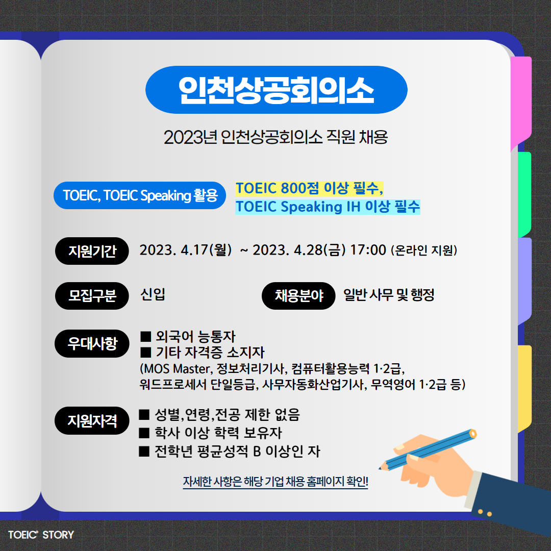 <토익스토리>가 인천상공회의소, 한국수력원자력, 동화그룹 채용 정보를 안내해 드립니다. 모집 마감일과 토익, 토익스피킹 성적 기준을 확인해 보세요!