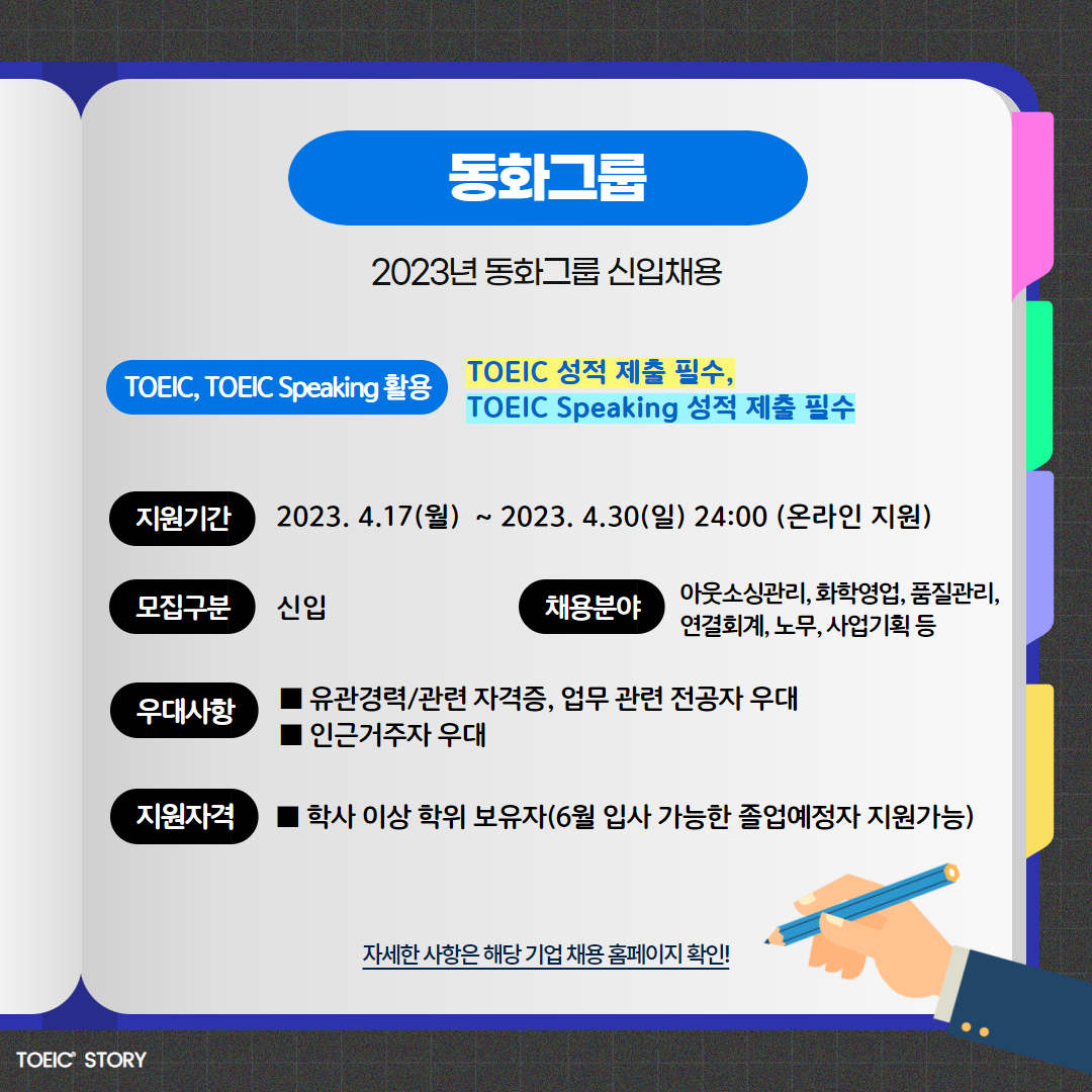 | 동화그룹 | 신입 | 2023 동화그룹 신입채용 | 4.30(일) 23:59 | TOEIC 성적 제출 필수, TOEIC Speaking 성적 제출 필수 |