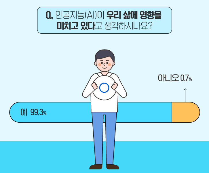 첫 질문으로, ‘인공지능(AI)’이 우리 삶에 미치는 영향력에 대해 알아보았습니다. '우리 삶에 영향을 미치고 있다'고 생각하는 응답자의 비율이 무려 99.3%로, ‘인공지능(AI)’의 압도적인 영향력을 실감할 수 있었습니다.