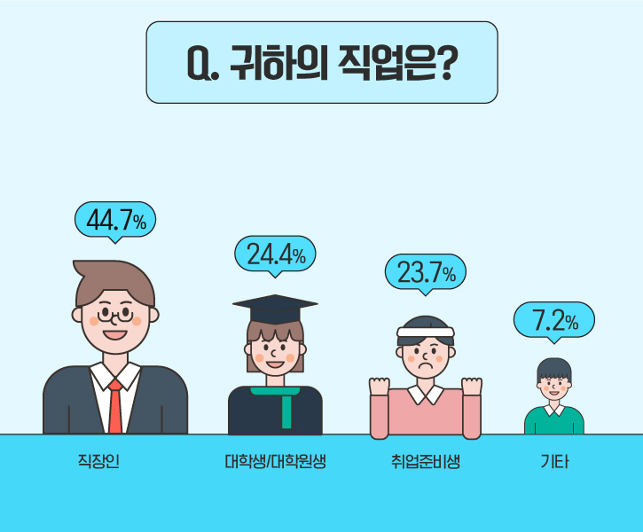 설문 응답자의 직업은 ‘직장인’이 44.7%로 가장 높은 비율을 차지했으며, ‘대학생/대학원생’이 24.4%로 그 뒤를 이었습니다. 다음으로 ‘취업준비생’과 ‘기타’가 각각 23.7%, 7.2%로 집계됐습니다.