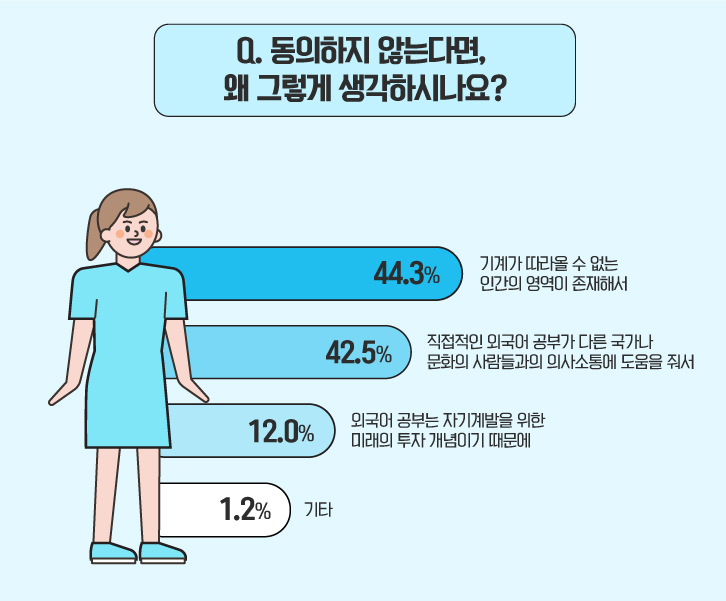 ‘인공지능(AI)’이 발달해도 외국어 공부의 필요성이 사라지지는 않을 것이라는 의견에 대한 세부적인 이유를 확인해 보았는데요. 44.3%의 응답자가 ‘기계가 따라올 수 없는 인간의 영역이 존재해서’라고 답했습니다. 이어 ‘직접적인 외국어 공부가 다른 국가나 문화의 사람들과의 의사소통에 도움을 줘서’라고 답한 응답자가 42.5%를 차지했습니다. 뒤이어, ‘외국어 공부는 자기계발을 위한 미래의 투자 개념이기 때문에(12.0%)’, ‘기타(1.2%)’ 순으로 나타났습니다.