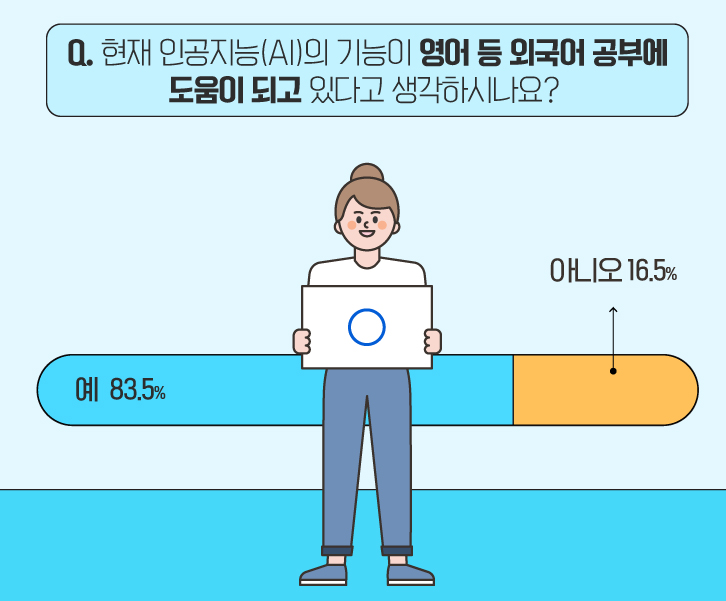 ‘인공지능(AI)’은 단순한 검색 도구를 넘어 영어 문법, 회화 등 외국어 학습 전반에도 활용되기 시작했는데요. 이에 현재 ‘인공지능(AI)’의 기능이 외국어 공부에 도움이 되고 있는지 물어보았습니다. ‘예’라고 답한 응답자의 비율이 83.5%로, 대다수가 ‘인공지능(AI)’의 교육적 측면에 대해 긍정적인 인식을 갖고 있었습니다. :)