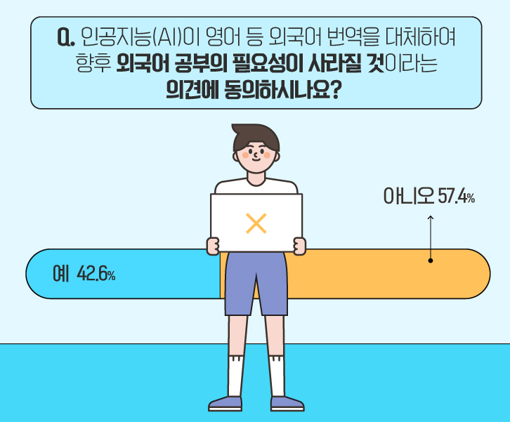 뒤이어 ‘인공지능(AI)’의 발달로 향후 외국어 공부의 필요성이 사라질 것이라는 의견에 동의하는지 물어보았는데요. ‘아니오’라고 답한 응답자가 57.4%로 인공지능이 고도화되어도 외국어 공부는 필요하다고 생각하는 분들이 많았습니다. 반대로, ‘예’라고 답한 응답자는 42.6%를 차지했습니다.