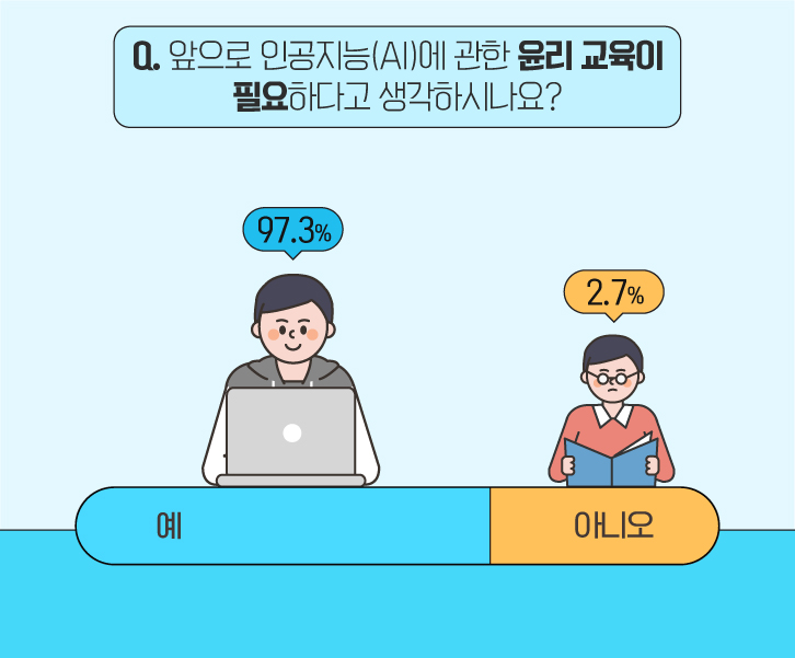 ‘인공지능(AI)’이 급속하게 발전함에 따라, 딥페이크(인공지능을 기반으로 활용한 인간 이미지 합성 기술)를 범죄에 악용하는 등 여러 윤리적인 문제들이 등장했는데요. 이에 <토익스토리>는 ‘인공지능(AI)’에 관한 윤리 교육의 필요성에 관해 물어보았습니다. 무려 97.3%의 응답자가 윤리 교육이 필요하다고 대답했네요!