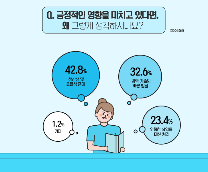 뒤이어 긍정적인 영향을 미친다고 생각한 이유에 관해 물어보았습니다. 42.8%의 응답자가 ‘생산성 및 효율성 증대’를 이유로 들었고, 32.6%의 응답자는 ‘과학 기술의 빠른 발달’을 이유로 꼽았습니다. 이어 ‘위험한 작업을 대신 처리(23.4%)’, ‘기타(1.2%)’ 순으로 나타났네요!