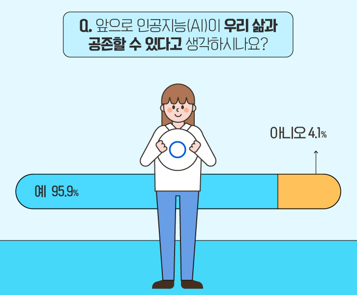 마지막으로, 앞으로 ‘인공지능(AI)’이 우리 삶과 공존할 수 있는지 물어보며 설문을 마무리했는데요. 95.9%의 응답자가 ‘예’라고 답하며, 설문 응답자 대다수가 우리 삶과 ‘인공지능(AI)’의 공존을 예상했습니다. :)