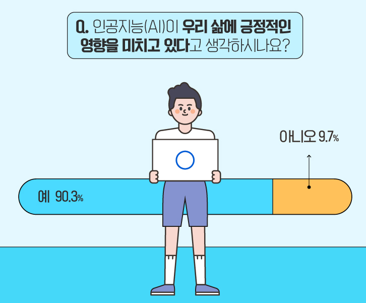 이처럼 ‘인공지능(AI)’의 존재감이 커지고 있는 가운데, ‘인공지능(AI)’은 우리 삶에 긍정적인 영향을 미치고 있을까요? 앞서, 우리 삶에 영향을 미치고 있다고 응답한 분들을 대상으로 다시 한번 물어보았는데요. 90.3%의 응답자가 ‘예’라고 답했습니다.