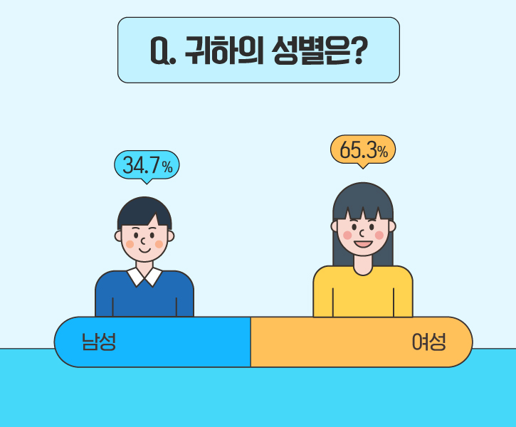 설문 응답자의 성비는 ‘남성’이 34.7%, ‘여성’이 65.3%로 여성분들이 많이 참여해 주셨네요!