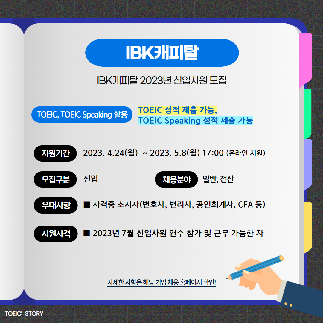| IBK캐피탈 | 신입 | IBK캐피탈 2023년 신입사원 모집 | 5.8(월) 17:00 | TOEIC 성적 제출 가능, TOEIC Speaking 성적 제출 가능 |