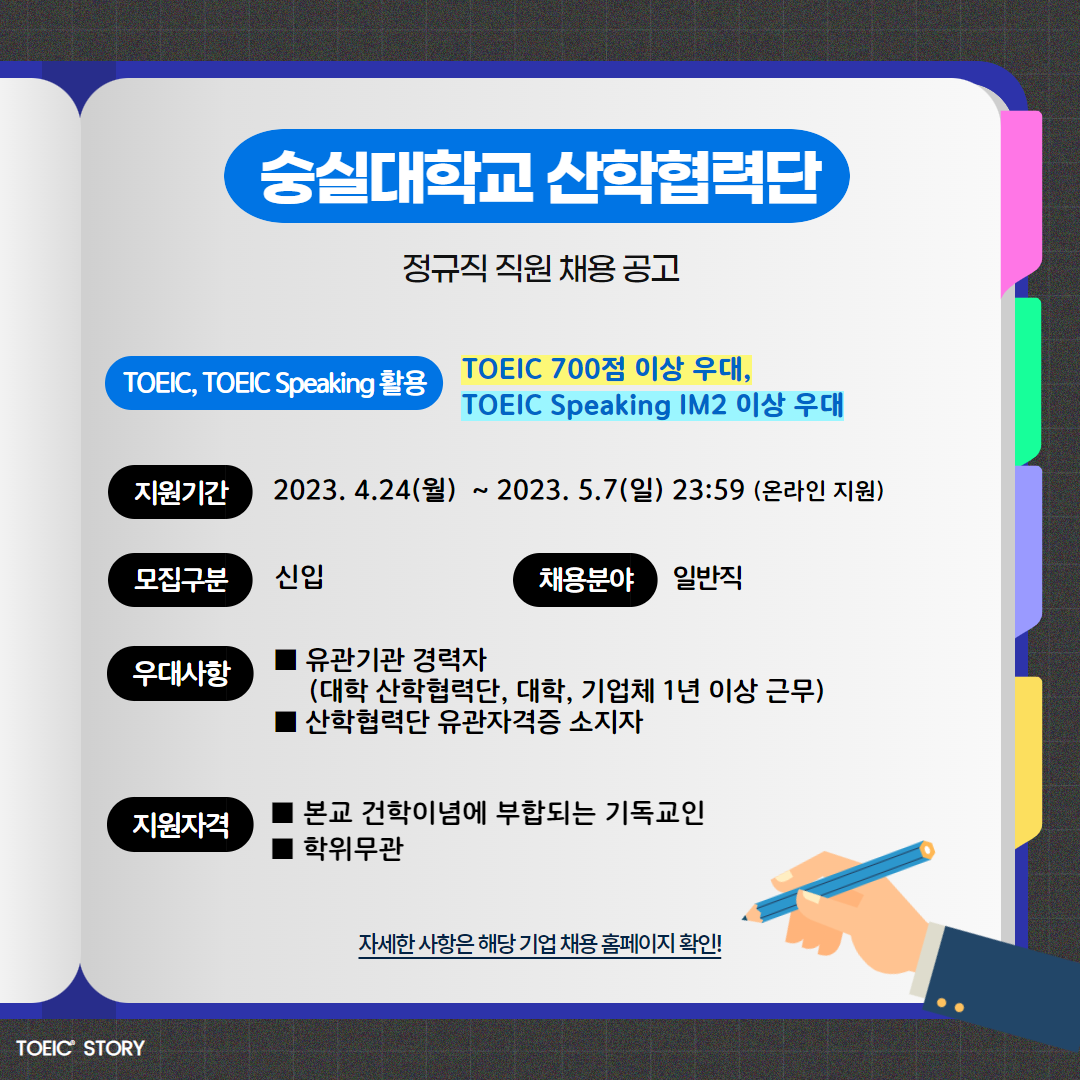 <토익스토리>가 숭실대학교 산학협력단, 군인공제회, IBK캐피탈 채용 정보를 안내해 드립니다. 모집 마감일과 토익, 토익스피킹 성적 기준을 확인해 보세요!