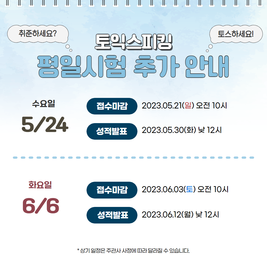 취준생 여러분을 위해 2023년 5/24(수), 6/6(화) 토익스피킹 평일 시험을 추가 시행합니다. :)