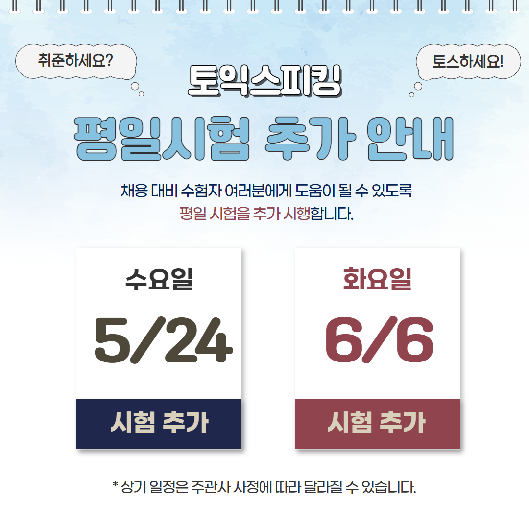 취준생 여러분을 위해 2023년 5/24(수), 6/6(화) 토익스피킹 평일 시험을 추가 시행합니다. :)