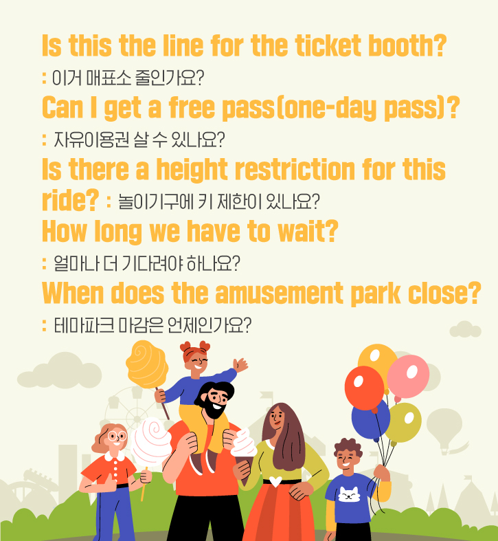 놀이공원에 들어선 순간부터, 우리는 놀이기구를 타기 위해 바삐 움직이는데요. 놀이기구를 타려고 하는데 키 제한이 있다면, ‘Is there a height restriction for this ride?’라고 물어볼 수 있습니다. 또, 놀이기구 대기 줄이 몇 시간 정도 소요되는지 알고 싶다면 ‘How long we have to wait?’이라고 얘기해 볼 수 있겠네요! 아쉬운 놀이공원 마감 시간이 다가온다면, ‘When does the amusement park close?’라고 물어볼 수 있습니다. :)