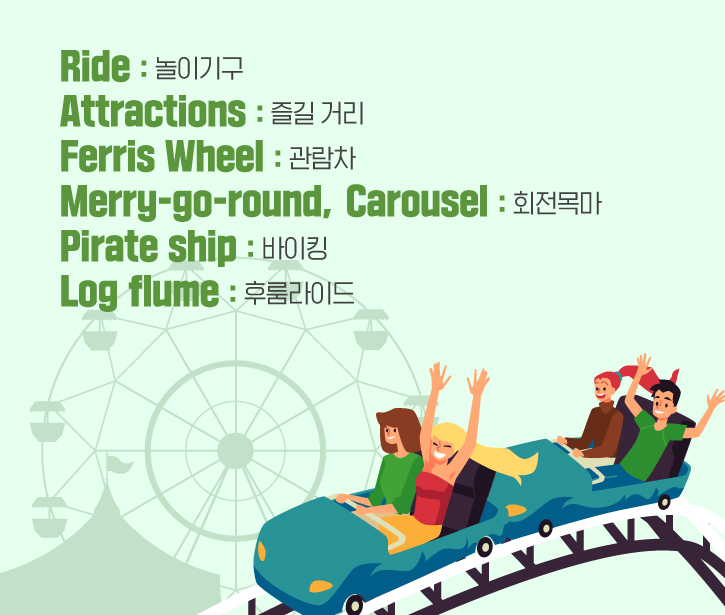 놀이공원에 입장했다면 이제는 신나게 즐길 시간입니다! 놀이공원의 꽃, 놀이기구는 영어로 ‘Ride’라고 하는데요. 우리나라는 놀이기구를 ‘Attraction’이라고 부르기도 하지만, 어트랙션은 보통 풍선 던지기와 사격과 같은 즐길 거리를 포함한다는 점, 함께 기억해 두면 좋을 것 같네요!
