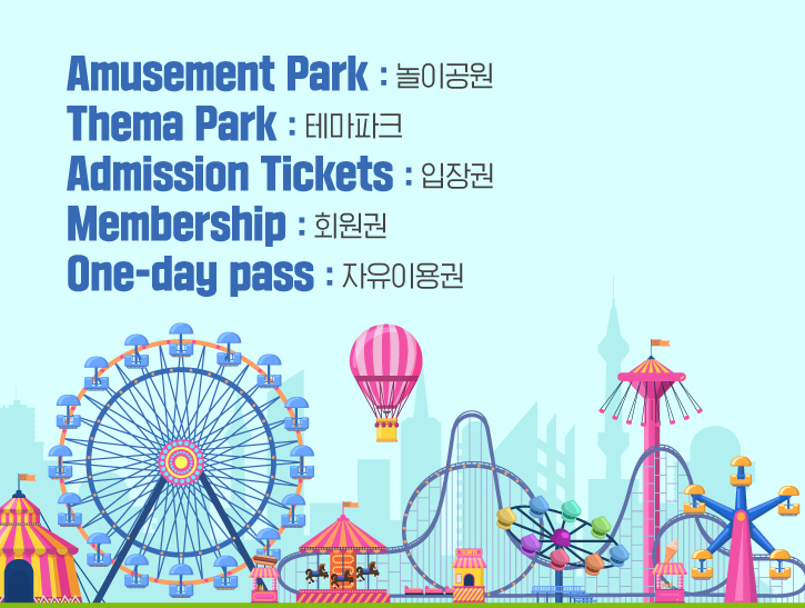놀이공원에 입장하기 위해서는 입장권, ‘Admission Tickets’을 구매해야 합니다. 만일 놀이공원을 자주 방문하는 이용객이라면, 연간으로 편리하게 이용할 수 있는 ‘Membership(회원권)’을 구매하는 것이 더 현명한 선택이겠죠? 하지만, 다수의 이용객이 자유이용권인 ‘One-day pass’를 구매할 텐데요. ‘one-day’라는 단어와 같이, 자유이용권은 온종일 놀이공원을 즐길 수 있는 이용권을 의미합니다. :)