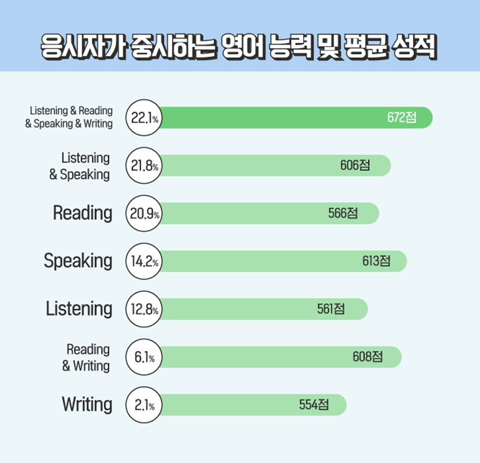 마지막으로 2022년 TOEIC 시험 응시자들이 가장 중요하게 생각하는 영어 능력은 무엇인지 알아봅시다! ‘듣기, 읽기, 말하기, 쓰기’ 모두 복합적으로 중요하다고 답한 응시자들이 22.1%로 가장 많았고, 점수 또한 672점으로 가장 높았습니다. 그다음은 ‘듣기와 말하기(21.8%)’가 차지했는데요. 이는 일상생활, 업무 상황 등 실생활에서의 영어 회화 능력이 더욱 강조되고 있는 사회상이 반영된 결과로 보입니다. 해당 응시자들의 평균 성적은 606점으로 4위를 차지했네요.