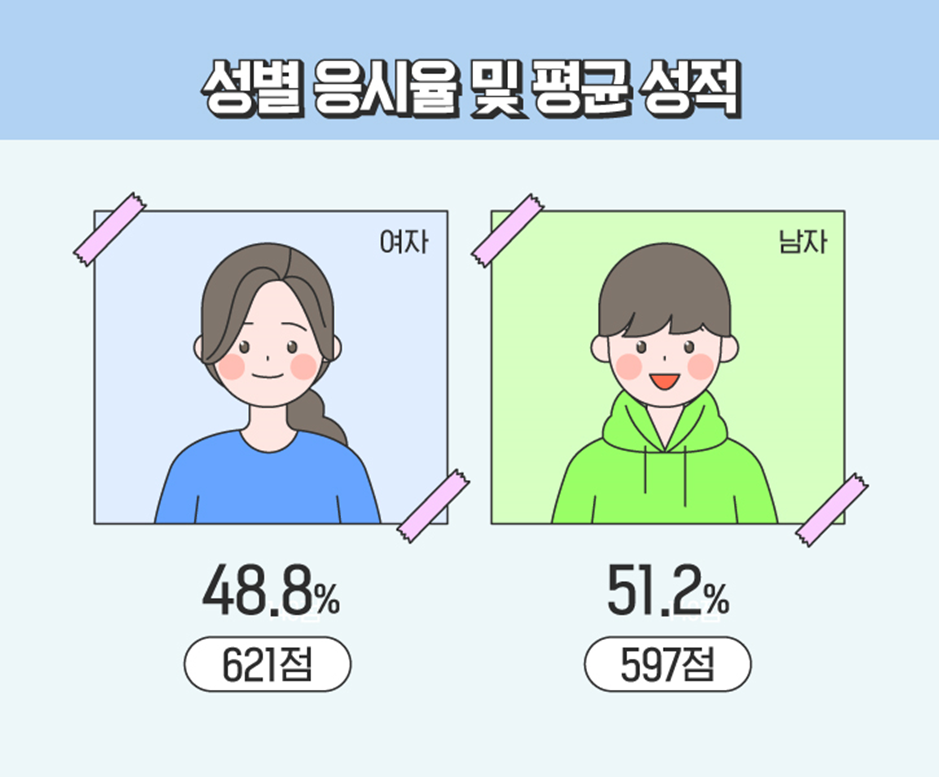 TOEIC에 응시한 세계인들의 성별 비율은 어떨까요? 2022년에는 남성 응시자가 51.2%, 여성 응시자가 48.8%로 남성 응시자가 2.4% 더 많은 것으로 나타났습니다. 성별에 따른 평균 점수는 여성이 621점, 남성이 597점으로 평균적으로 여성이 남성 보다 24점 높은 성적을 보였습니다.