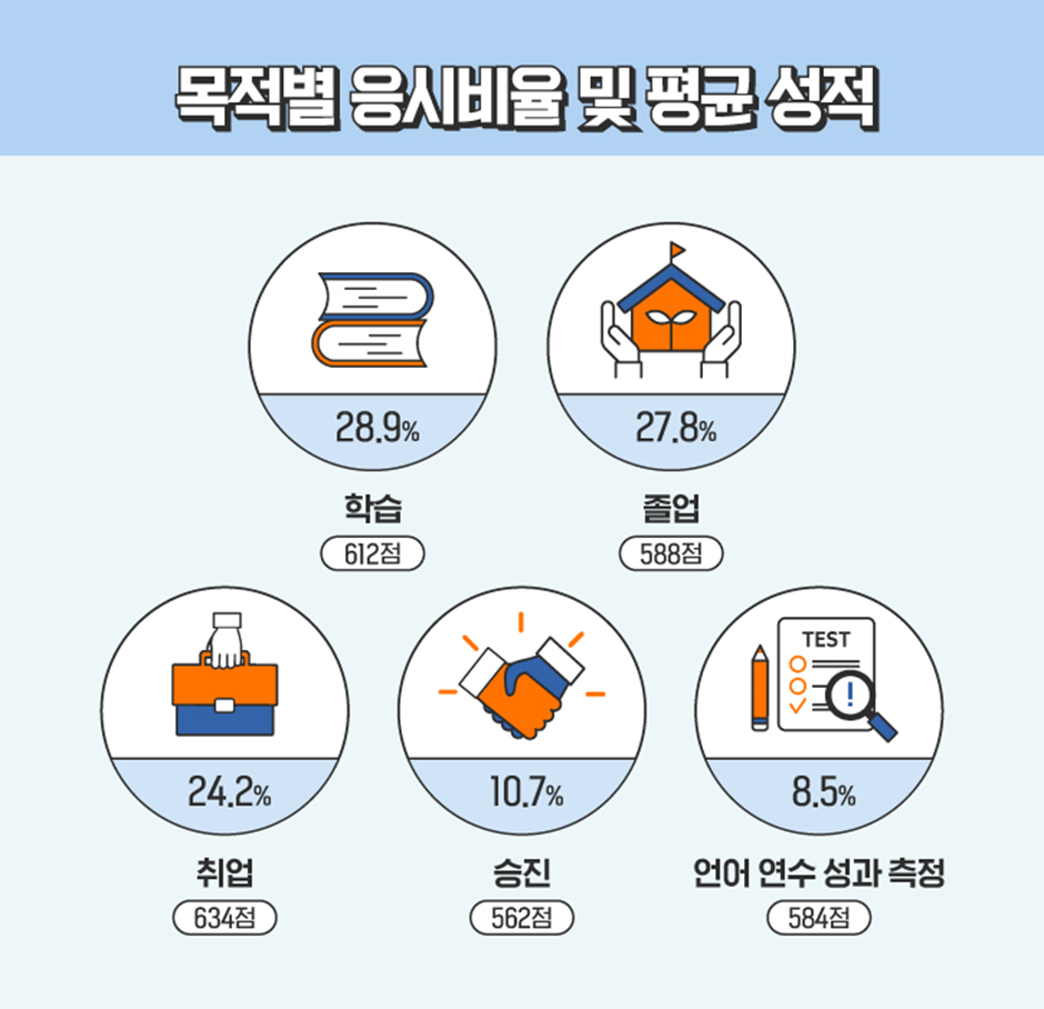 응시 목적에 따른 점수도 함께 살펴봤습니다. 가장 높은 비율을 보인 ‘학습’ 목적 응시자들의 평균 점수는 612점으로, ‘취업’ 목적 응시자들의 평균 점수 634점에 이어 2위를 기록했고, 이어서 ‘졸업(588점)’과 ‘언어 연수 성과 측정(584점)’, '승진(562점) 순으로 나타났습니다.