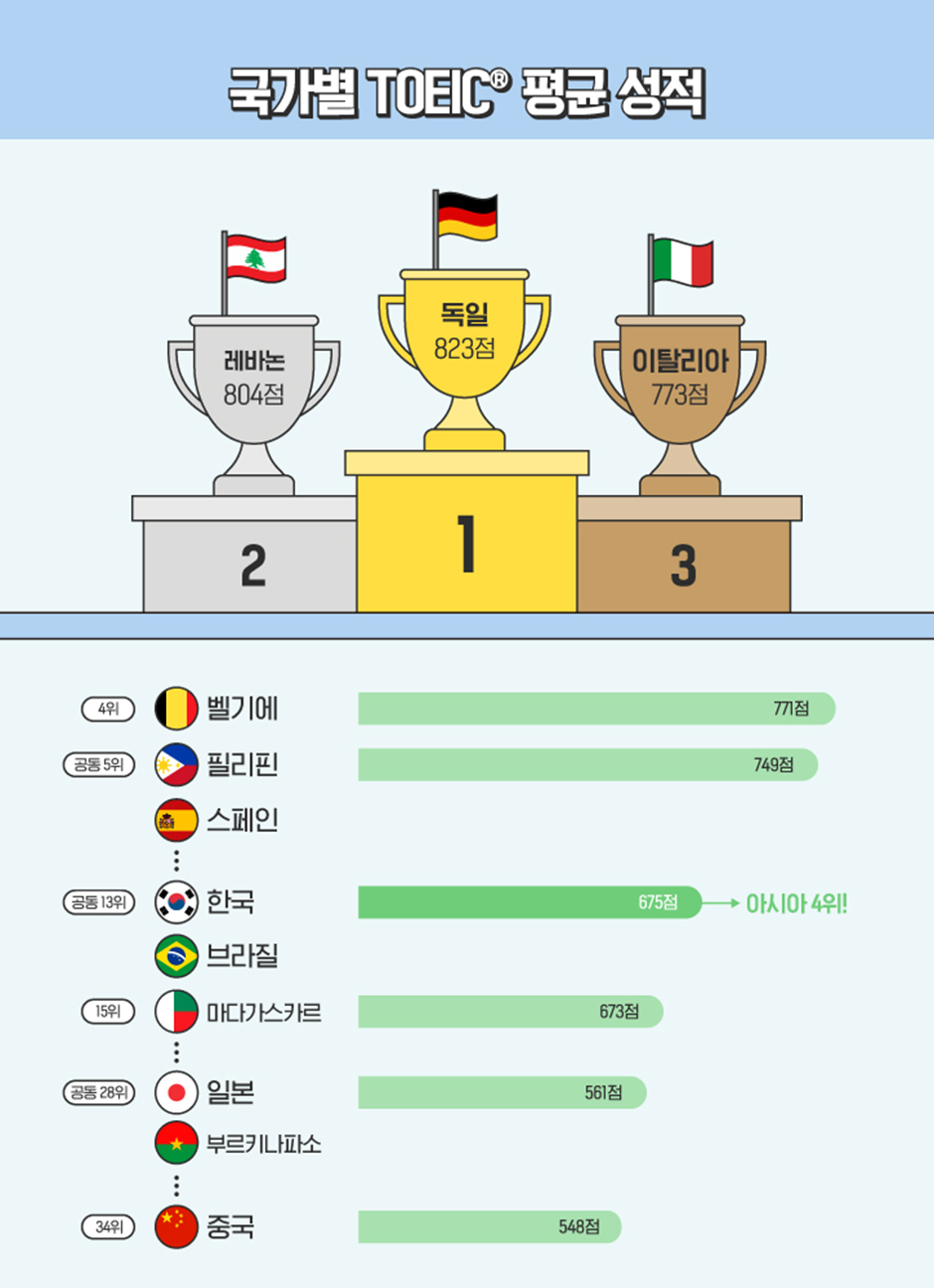 그렇다면 우리나라의 성적은 어떨까요? 2022년 한국의 TOEIC 평균 점수는 675점을 기록하며 브라질과 공동 13위를 차지했습니다. 2021년 21위의 기록과 비교하면 성적이 많이 향상되었죠? 아시아에서도 ▲레바논(804점) ▲필리핀(749점) ▲요르단(686점)에 이어 4위를 기록했습니다. 그 외 아시아에서는 일본(561점)이 부르키나파소와 공동 28위, 중국(548점)이 34위를 차지했습니다.