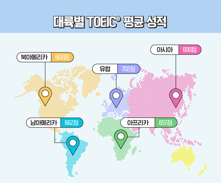 TOEIC은 국제 의사소통 영어 능력 시험(The Test Of English for International Communication)의 약자인 만큼, 전 세계의 많은 사람들이 응시하는 시험인데요. 과연 2022년에는 어떤 대륙의 평균 점수가 가장 높았을까요? 바로 유럽이었습니다. 유럽(702점)은 유일하게 평균 성적 700점을 넘은 대륙으로, 그 뒤를 이은 남아메리카(662점)와 40점의 점수 차이를 보이고 있네요. 남아메리카의 뒤를 이어 아프리카(657점), 북아메리카(602점), 아시아(600점) 순으로 나타났습니다.