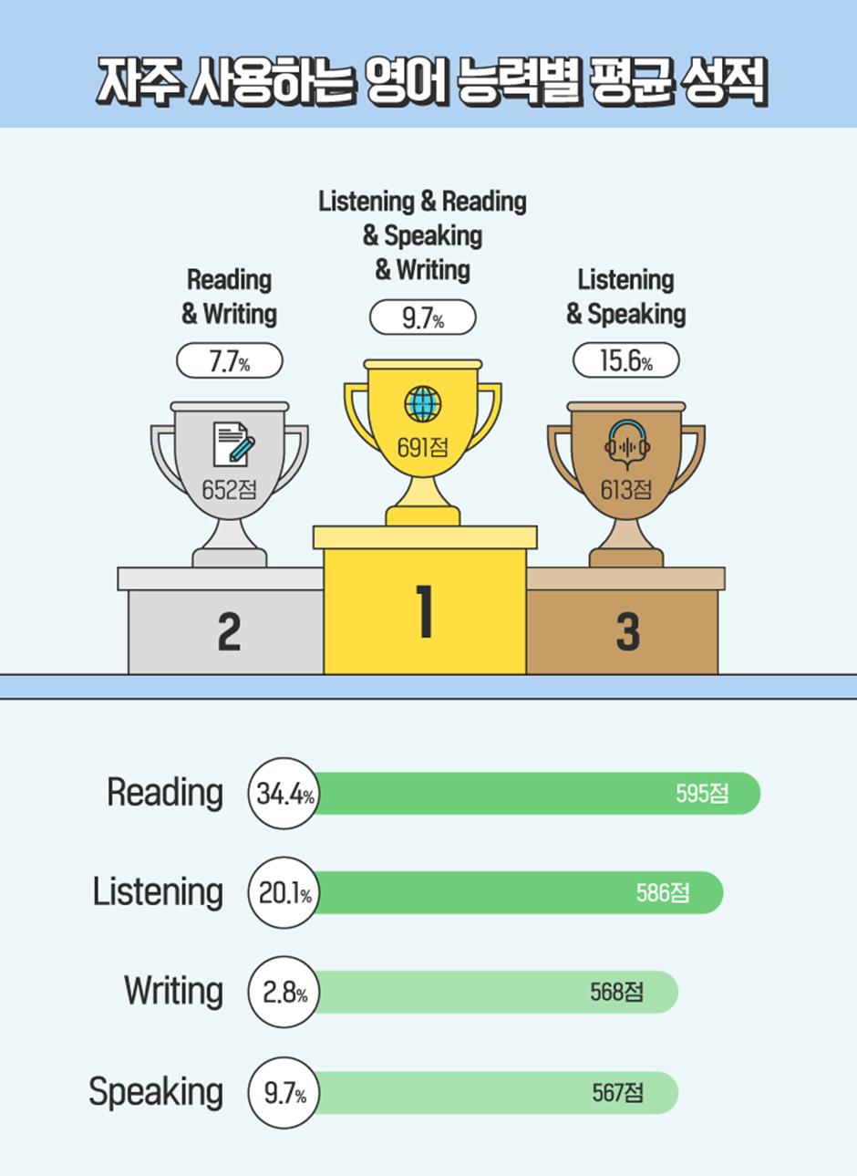 일상에서 영어 듣기, 읽기, 말하기, 쓰기 능력 중 어느 능력을 가장 많이 사용하는지에 따라서도 점수 차이가 나타나는데요. 이 네 가지 능력 모두 자주 사용한다고 응답한 응시자들이 691점을 기록해 가장 높은 성적을 거뒀습니다. 2위는 ‘읽기와 쓰기’ 능력을 주로 사용하는 응시자들이 차지했는데, 1위와는 약 40점의 점수 차이를 보였습니다. 그만큼 일상에서 다양한 능력을 자주 구사하는 것이 영어 의사소통 실력 향상을 위해 중요하다는 의미인 것 같습니다. 3위 역시 다중 능력인 ‘듣기와 말하기(613점)’가 차지했네요.