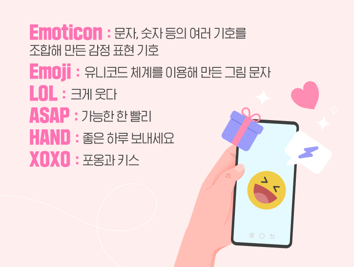 다음으로 SNS에서 사용하는 다양한 줄임말을 소개해 드리겠습니다. 먼저 ‘LOL’은 ‘Laugh out loud(크게 웃다)’의 줄임말로, 웃긴 상황에서 주로 사용하는 영어 표현입니다. 우리가 흔히 쓰는 ‘ㅋㅋㅋ’, ’ㅎㅎㅎ’ 표현과 비슷한 표현이라고 할 수 있죠! 다음으로, ‘ASAP’은 ‘As soon as possible(가능한 한 빨리)’의 줄임말인데요. 상대방에게 무언가를 빨리 요구해야 하거나 회신이 필요한 상황에서 주로 쓰이곤 합니다. ‘HAND’는 ‘Have a nice day(좋은 하루 보내세요)’의 줄임말로, 우리가 흔히 알고 있는 ‘Hand(손)’ 외에도 줄임말 표현으로도 쓰인답니다.