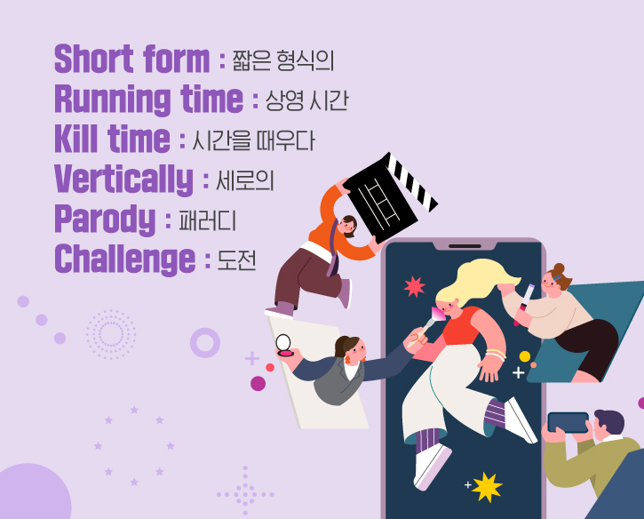 마지막으로 숏폼 관련 영어 표현을 알아보겠습니다. ‘Short-form’이란 단어 그대로 1분 내외의 짧은 형식의 영상 콘텐츠를 말하는데요. ‘Running time(상영 시간)’이 짧아 시간을 때우는 데도 효과적이라고 할 수 있죠! 이때 ‘시간을 때우다’라는 표현은 영어로 ‘Kill time’이라고 하는데요. 킬링타임용 드라마, 킬링타임용 영화처럼 심심할 때 시간을 보내기 좋은 콘텐츠를 말할 때 종종 쓰인답니다.