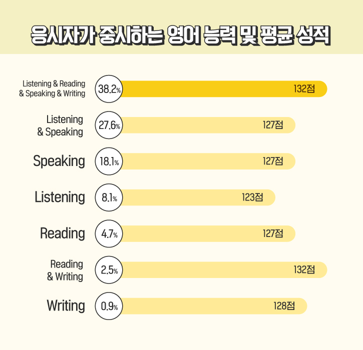 마지막으로, 토익스피킹 응시자가 중시하는 영어 능력 및 평균 성적에 대해 알아볼까요? 전체 응답자 중 38.2%가 영어의 종합적인 능력(듣기ㆍ읽기ㆍ말하기ㆍ쓰기)을 중요시하는 것으로 나타났습니다. 또, 2021년에 이어 ‘듣기ㆍ말하기’와 ‘말하기’를 중시하는 응답자가 각각 27.6%, 18.1%의 비율을 차지했는데요. 이를 통해 많은 응시자들이 영어의 ‘말하기’ 능력을 중시하는 것을 살펴볼 수 있었습니다. :)