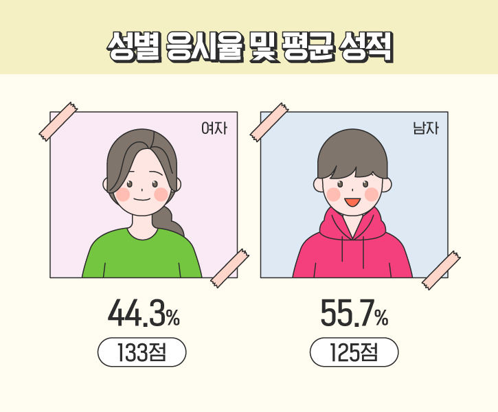 다음은 '성별 응시율 및 평균 성적'입니다. 2022년에도 남성이 여성에 비해 토익스피킹 시험에 더 많이 응시하는 것으로 나타났는데요. 남성 응시율은 55.7%로 44.3%인 여성 응시율보다 11.4% 더 높았습니다. 또, 평균 성적은 여성이 남성보다 8점 더 높게 집계됐네요. :)
