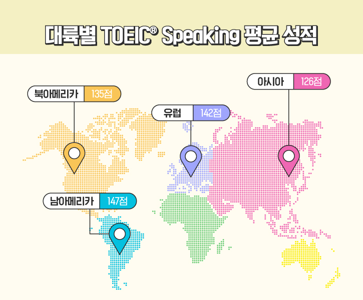 토익스피킹은 대학교 및 기업, 공공기관 등 여러 분야에서 활용 중인 공인 어학 능력 시험입니다. 때문에, 전 세계의 많은 국가들이 토익스피킹을 시행하고 있죠. 그렇다면 토익스피킹 성적이 가장 높은 대륙은 어디일까요? 2022년에는 남아메리카가 147점으로 1위를 기록했습니다. 2021년 대비 8점이나 상승하며, 전체 3위에서 1위까지 올랐죠! 이어 유럽이 142점으로, 2위를 달성했습니다. 북아메리카는 2021년 141점에서 2022년 135점으로 6점 하락하여 전체 3위를 차지했습니다. 대한민국이 속한 아시아는 2021년에 비해 1점 소폭 상승한 모습을 보였네요. :)