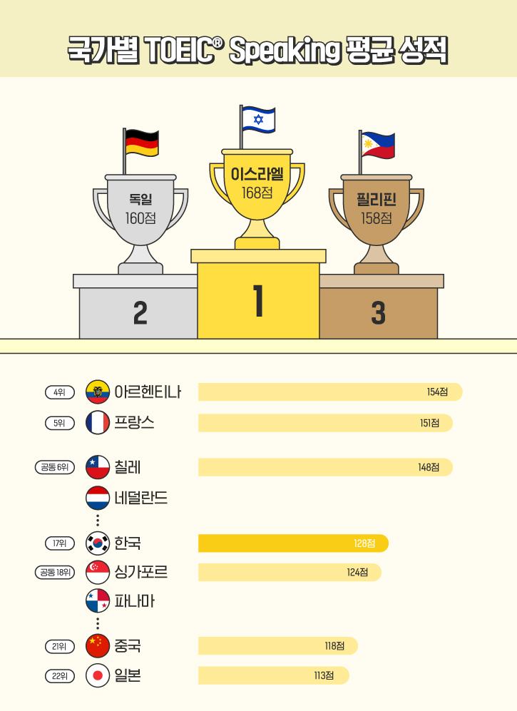 다음으로, ‘국가별 평균 토익스피킹 성적’은 어떨까요? 2022년에는 이스라엘이 168점을 기록하며 1위를 차지했습니다. 2020년과 2021년 모두 1위의 영광을 맛보았던 독일은, 160점의 점수로 2등을 차지했네요! 필리핀도 2021년 대비 1점 소폭 상승하여 TOP3 안에 랭크됐습니다. 그 외에도 ▲아르헨티나(154점) ▲프랑스(151점) ▲칠레/네덜란드(148점)가 상위권을 기록했네요. :)