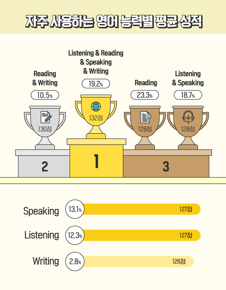 다음으로 응시자가 자주 사용하는 영어 능력별 평균 성적을 알아보겠습니다. 2022년에도 ‘듣기ㆍ읽기ㆍ말하기ㆍ쓰기’ 전 영역을 고르게 사용한다고 답한 응시자의 평균 성적이 132점으로 가장 높게 나타났습니다. 이를 통해 토익스피킹이 단순 말하기 시험이 아닌, ‘듣기ㆍ읽기ㆍ말하기ㆍ쓰기’의 역량을 아우르는 시험이라고 정리해 볼 수 있겠네요! 2위와 3위는 2021년과 동일하게 ‘읽기ㆍ쓰기’, ‘읽기’와 ‘듣기ㆍ말하기’가 차지했습니다.